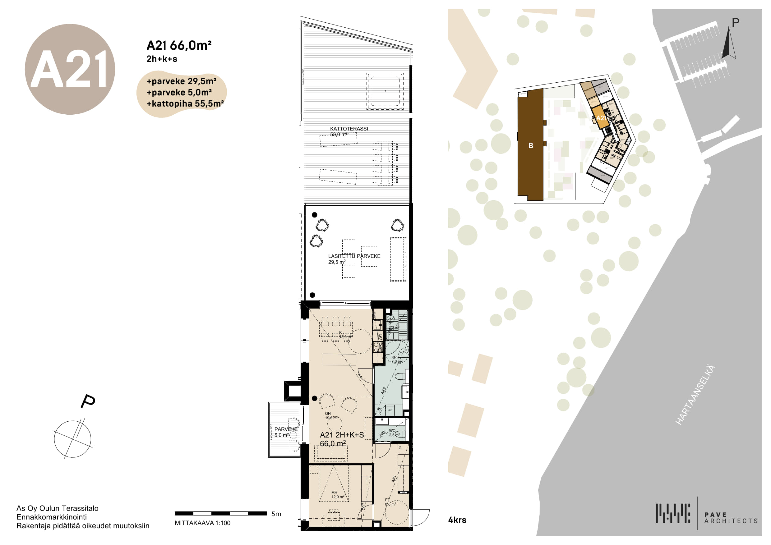 Varattu | A21 | 66m2 | 2h+k+s+parveke | mh. 158 000€ vh. 395 000€ | Tutustu |