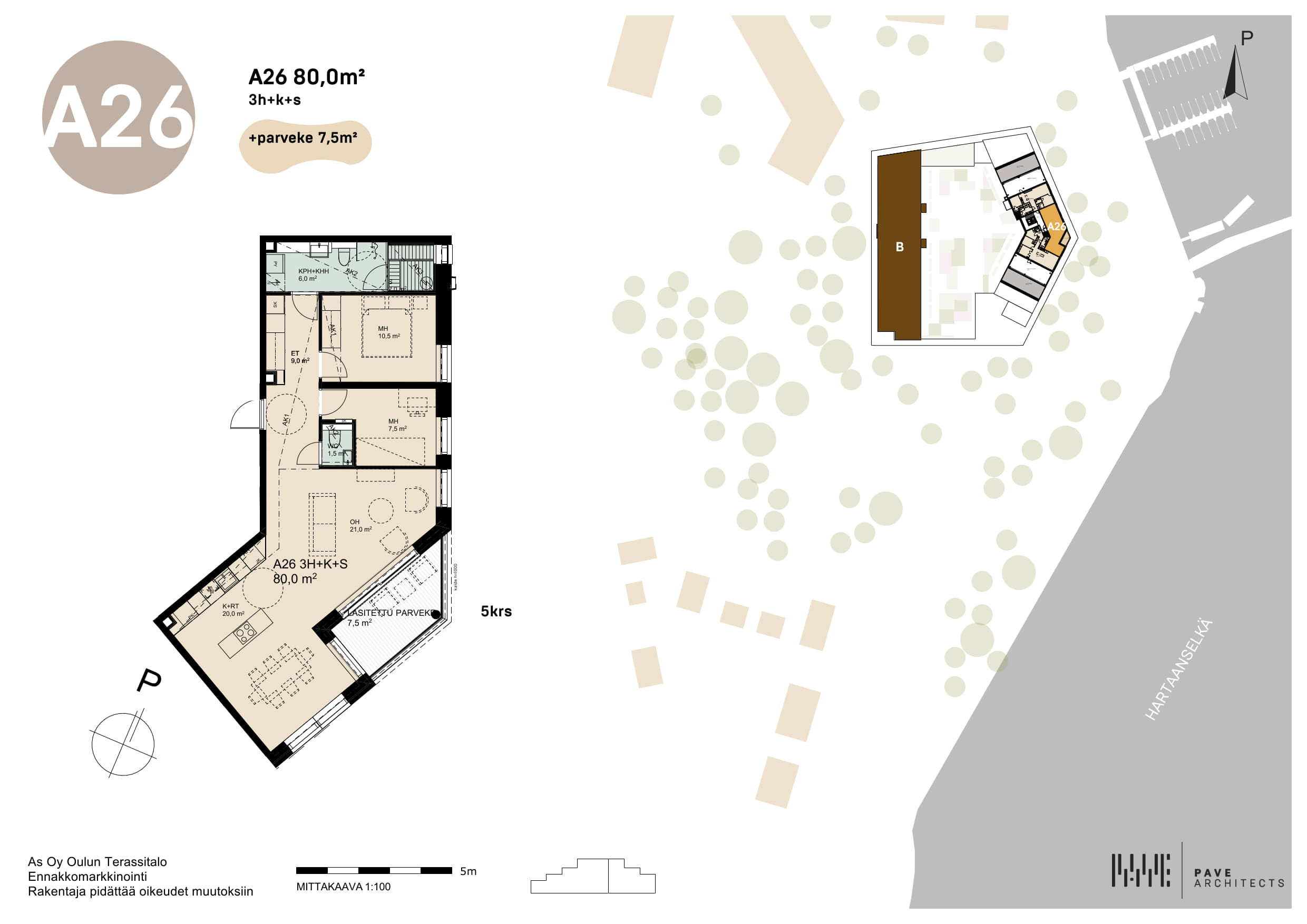 Varattu | A26 | 80m2 | 3h+k+s+parveke | mh. 230 000€ vh. 575 000€ | Tutustu |